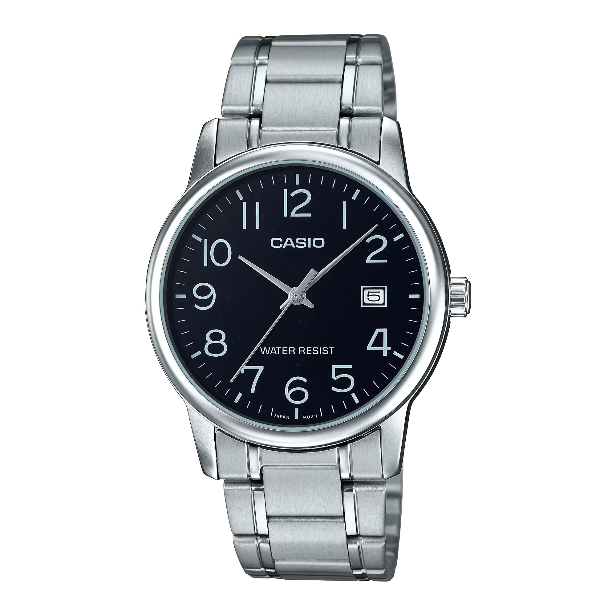 The Casio MTP-V002D-1B delivers a sleek, timeless look ideal for any setting. Designed with a black dial featuring bold white Arabic numerals and a practical date display, this watch combines clarity with everyday sophistication. The stainless steel case and bracelet provide durability and comfort, while its water resistance makes it perfect for daily wear. A versatile piece that transitions effortlessly from business meetings to casual outings.