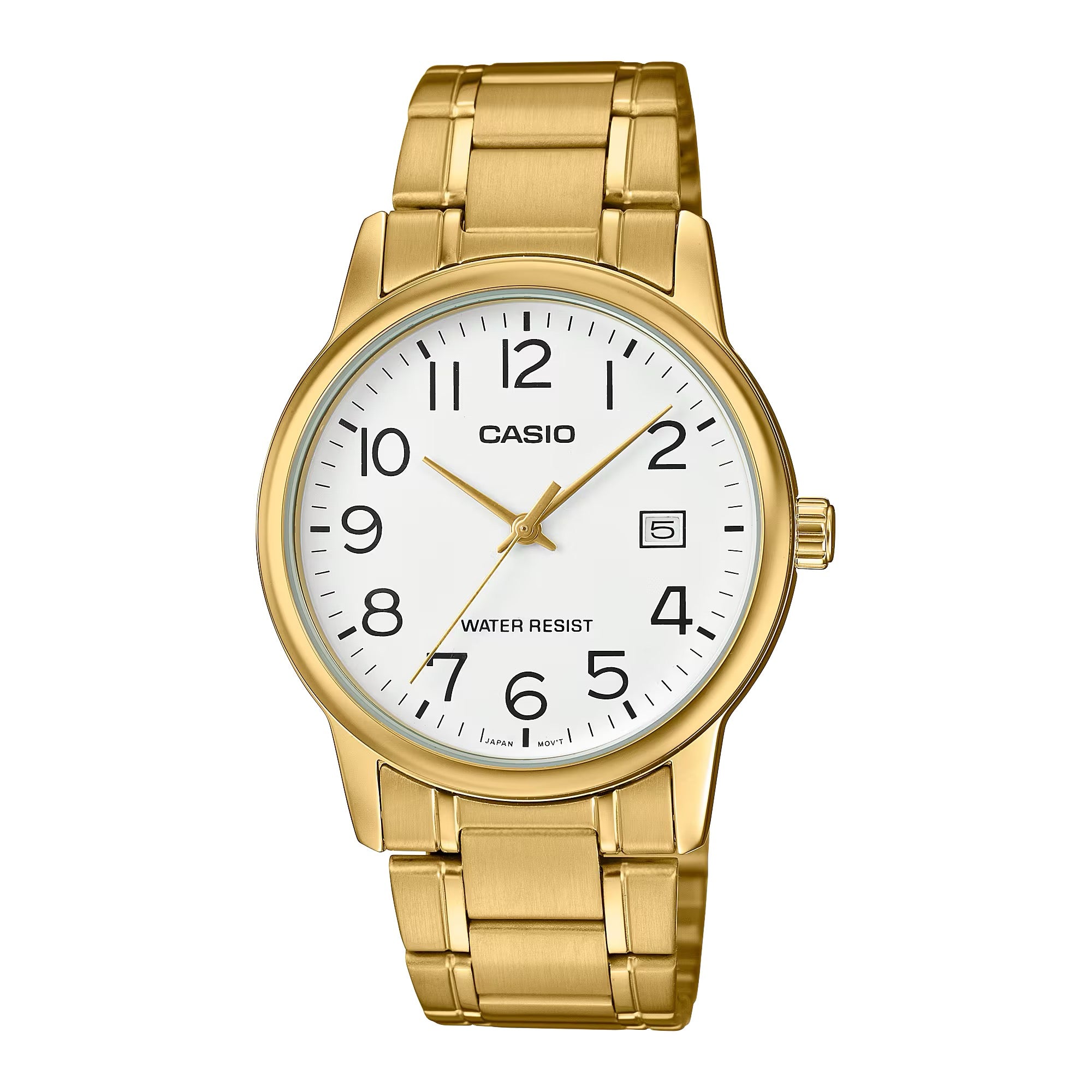 The Casio MTP-V002G-7B2UDF exudes timeless elegance with a touch of luxury. Featuring a crisp white dial with bold black Arabic numerals and a radiant gold-tone stainless steel bracelet, this watch balances clarity and sophistication. Designed with precision quartz movement and water resistance for everyday wear, itÕs a versatile accessory that complements both casual and formal attire.