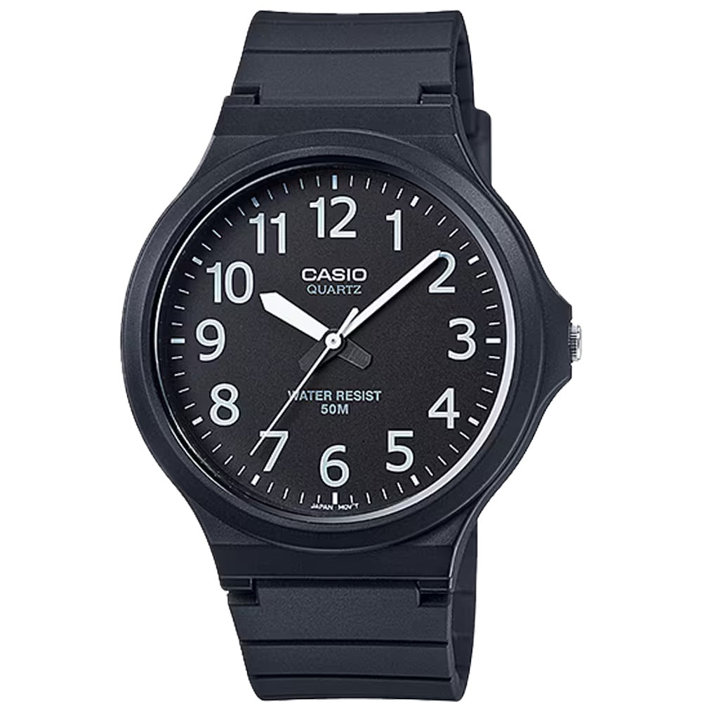 The Casio MW-240-1BV is a menÕs analog watch that combines simplicity with functionality. It features a large black dial with easy-to-read Arabic numerals and a minimalist design, making it suitable for everyday wear. The watch is equipped with a 50-meter water resistance, providing protection against splashes and brief immersion in water. Its lightweight construction ensures comfortable wear throughout the day. Powered by a reliable quartz movement, the MW-240-1BV offers accurate timekeeping with minimal maintenance. The durable resin case and band contribute to the watchÕs resilience, making it a practical choice for those seeking a straightforward timepiece.