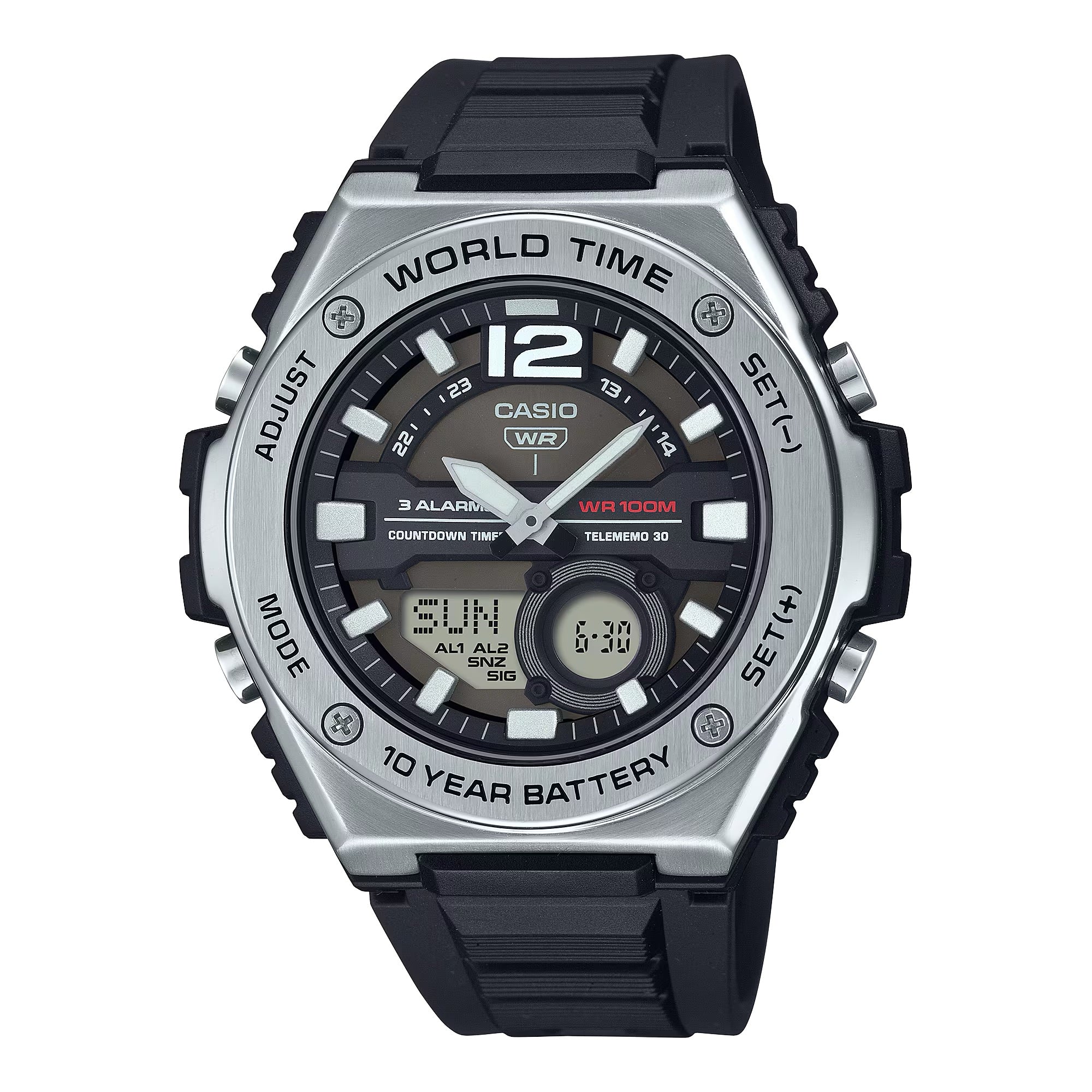 The Casio MWQ-100-1AVCF is a versatile analog-digital watch that combines functionality with a sleek, modern design. It features a black resin band and a resin/stainless steel case, ensuring both durability and a contemporary aesthetic. The watch is equipped with a 10-year battery life, minimizing the need for frequent replacements and providing long-term reliability. With a water resistance of up to 100 meters, itÕs well-suited for various water activities, including swimming and snorkeling. The world time function allows you to view the current time in 30 cities across 29 time zones, making it ideal for travelers. Additional functionalities include a Telememo feature that stores up to 30 sets of data (names and phone numbers), a 1/100-second stopwatch, countdown timer, and three daily alarms with one snooze alarm, catering to diverse timekeeping needs. Its sporty yet sophisticated design makes the MWQ-100-1AVCF a versatile accessory for both casual and active lifestyles.