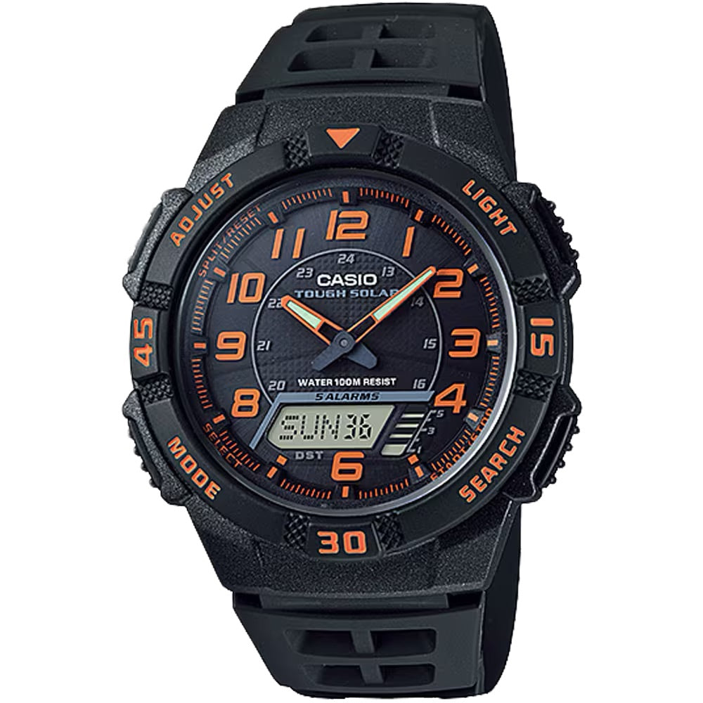 The Casio AQS-800W-1B2V is a versatile timepiece that combines functionality with a sporty design. Powered by CasioÕs Tough Solar technology, it ensures continuous operation without the need for battery replacements. The watch features both analog and digital displays, providing clear and precise timekeeping. Its black resin band and case are complemented by orange accents on the dial, adding a vibrant touch to its appearance. With 100-meter water resistance, itÕs suitable for various water activities. Additional features include world time across 31 time zones, five daily alarms, and dual countdown timers, making it ideal for sports and travel enthusiasts. The LED light ensures readability in low-light conditions.