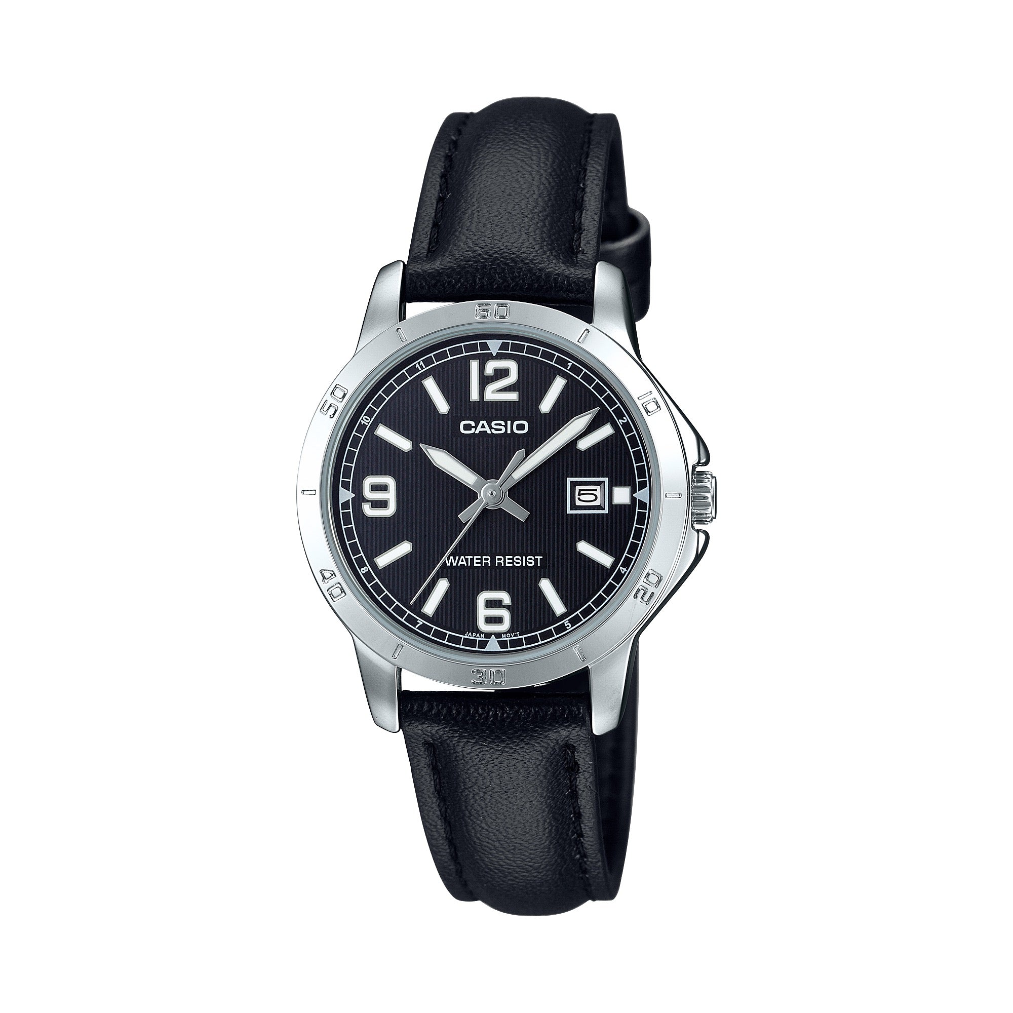 The Casio LTP-V004L-1B is a timeless blend of elegance and functionality. Featuring a deep black dial with bold silver-tone numerals, this watch delivers a sleek, modern look that transitions effortlessly from day to night. The genuine black leather band adds comfort and sophistication, while the polished silver bezel and date display complete its refined appeal.
